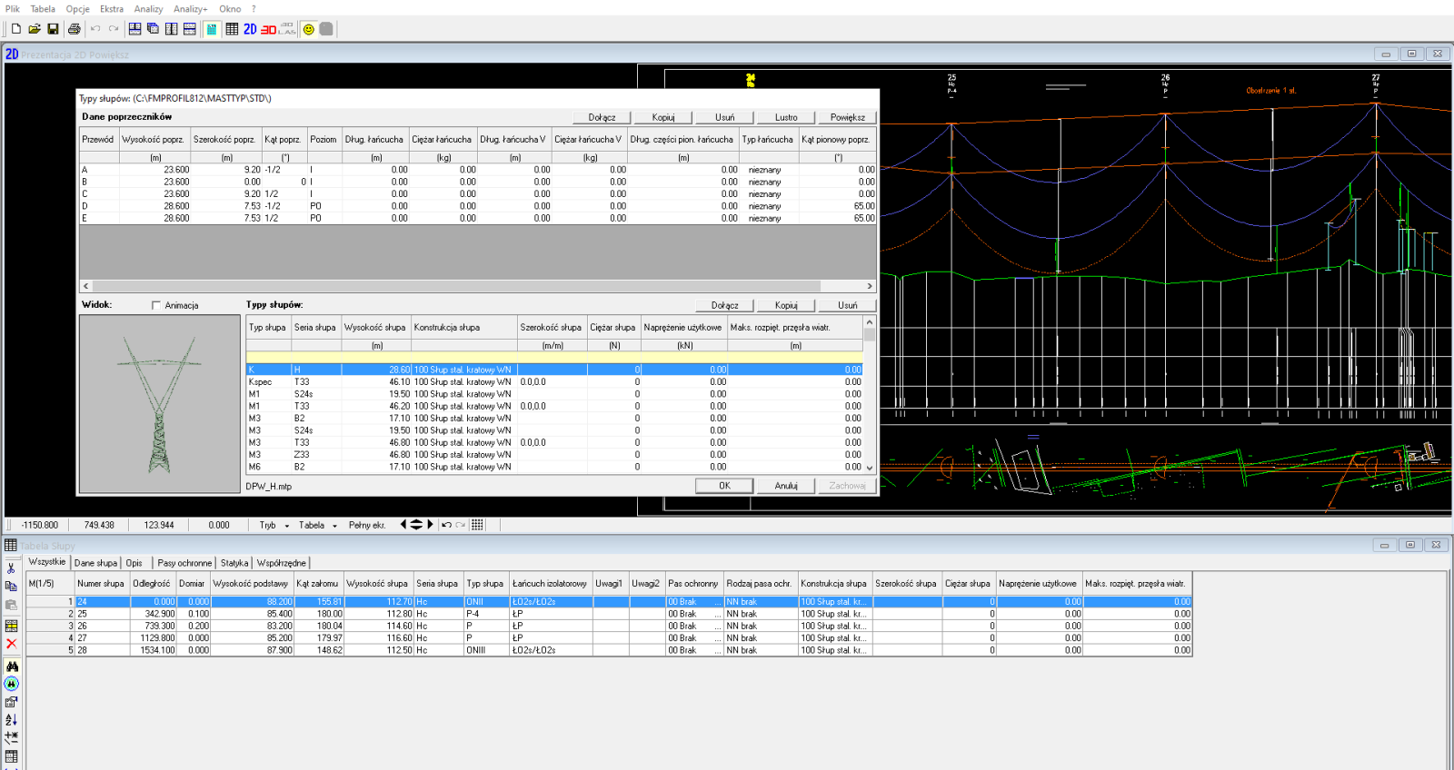 - Obliczanie zwisów dla max. 26 przewodów